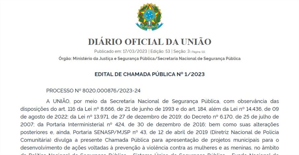 O edital de chamamento público foi publicado no Diário Oficial desta sexta-feira, 17 de março. O objetivo do edital é selecionar projetos municipais voltados para a prevenção e o enfrentamento à violência e à criminalidade contra mulheres e meninas, em ações desenvolvidas pelas Guardas Municipais, abrangendo uma das seguintes áreas temáticas: